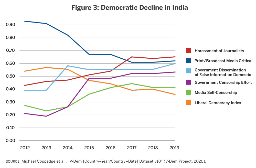 - “Freedom in the World 2021 – India,” Freedom House, 2021, https://freedomhouse.org/country/india/freedom-world/2021; Vindu Goel and Jeffrey Gettleman, “Under Modi, India’s Press Is Not So Free Anymore,” New York Times, April 2, 2020, https://www.nytimes.com/2020/04/02/world/asia/modi-india-press-media.html.