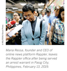 Maria Ressa’s case has received significant international attention, but the call to action may have come too late. Accusations of libel, tax evasion, and terrorism have threatened independent voices in the Philippines for several years, alongside online trolls that harass and “red-tag” those who disagree with the Duterte government.44 These trends are a harbinger of a grim future. They show that attacks on independent journalism are not limited to statements from Duterte45 or the prosecution of one prominent journalist. Rather, they demonstrate the vast potential for growing limitations on independent media over the next several years.